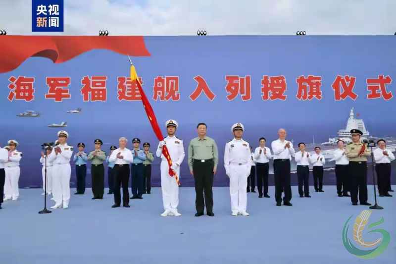 11月5日,我国第一艘电磁弹射型航空母舰福建舰入列授旗仪式在海南三亚某军港举行。中共中央总书记、国家主席、中央军委主席习近平出席入列授旗仪式并登舰视察。这是习近平向福建舰舰长、政治委员授予军旗。